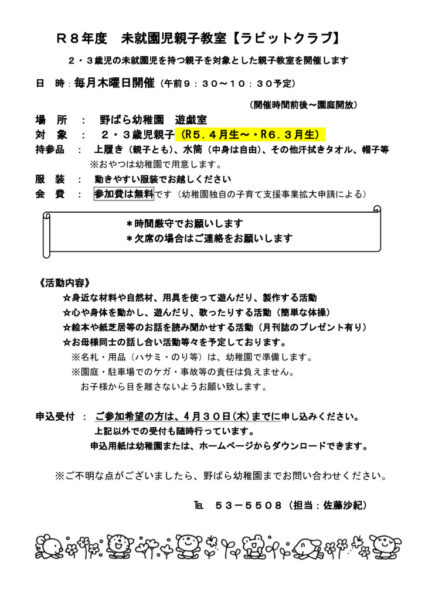 参加費は無料です(幼稚園独自の子育て支援事業拡大申請による)。ぜひ、野ばら幼稚園に遊びにきてください♪