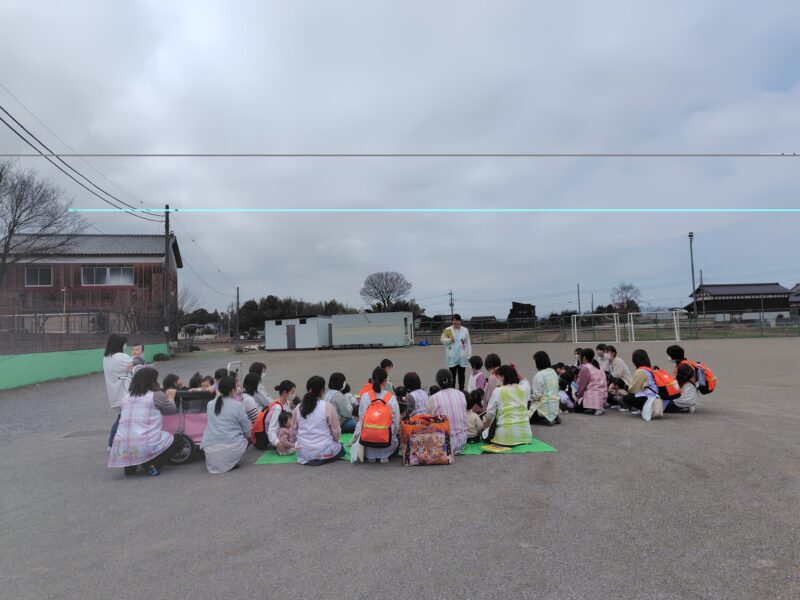 3月に入りました!今日は乳児部の避難訓練。職員室から火が出たという想定で園庭〜サンサン広場へと2次避難しました。