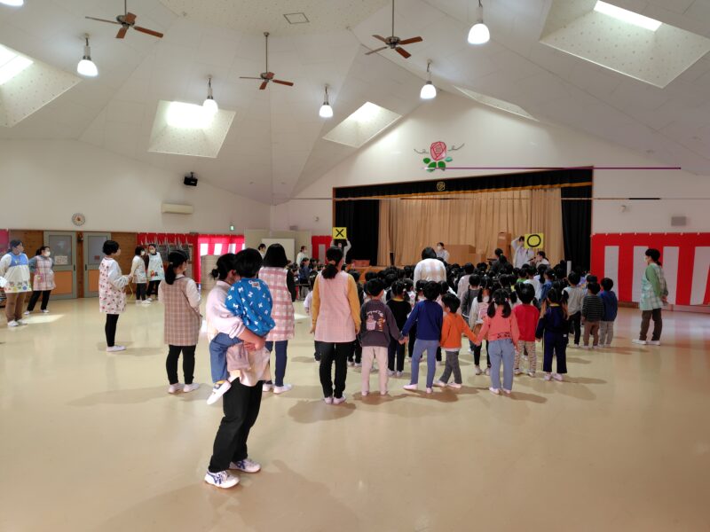 遊戯室でお別れ会を開催しましたm(__)mお世話になった年長組さんと一緒に歌を歌ったり、お別れの言葉を交わしたり、プレゼント交換をしたり。異年齢でチームを組み、○×クイズに挑戦し、最後はみんなで花道を作り、拍手で送りました\(^o^)/
